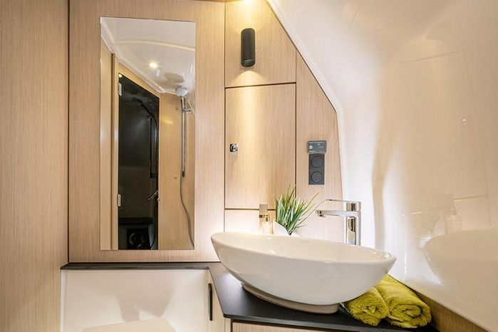 The BAVARIA VIDA 33 is available in two versions, an open version and a version with a hard top. Together with the sporty hull design with recessed hull windows, the result is the BAVARIA VIDA 33’s dynamically elegant silhouette. The foreship also offers two layout variants. The choice is between a flat foredeck with space for a generous sunbed area and a lounge area at the bow with a cocktail table and space for six people.