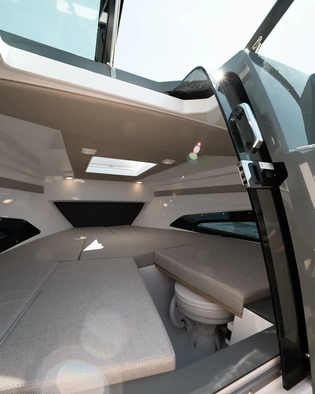 The Noblesse 720 perfectly embodies the essence of a day cruiser. Relax on the bow sunbed and enjoy your favorite tunes, or move to the aft sunbed or swimming platform sunbeds for a change of scenery. The social layout is ideal for entertaining family and friends, and the Webasto heater ensures cozy summer evenings spent in the plush cabin. With its nimble handling and thrusters, the Noblesse 720 offers an exhilarating driving experience and makes docking a breeze.