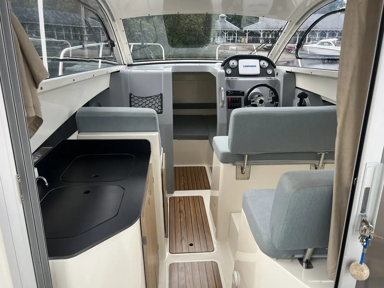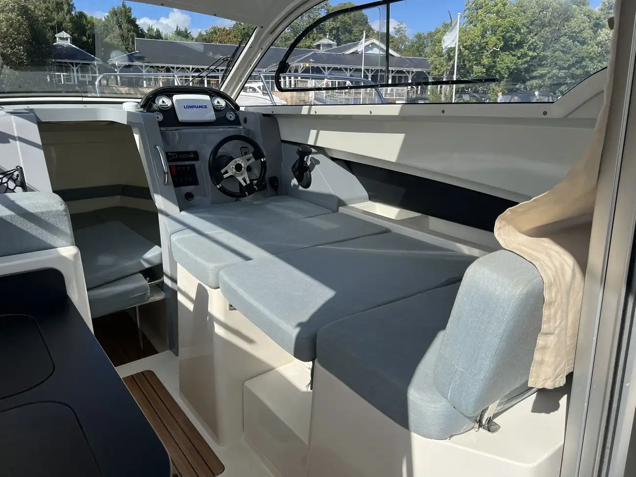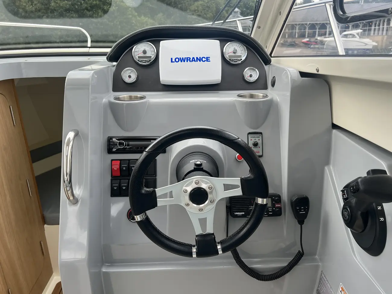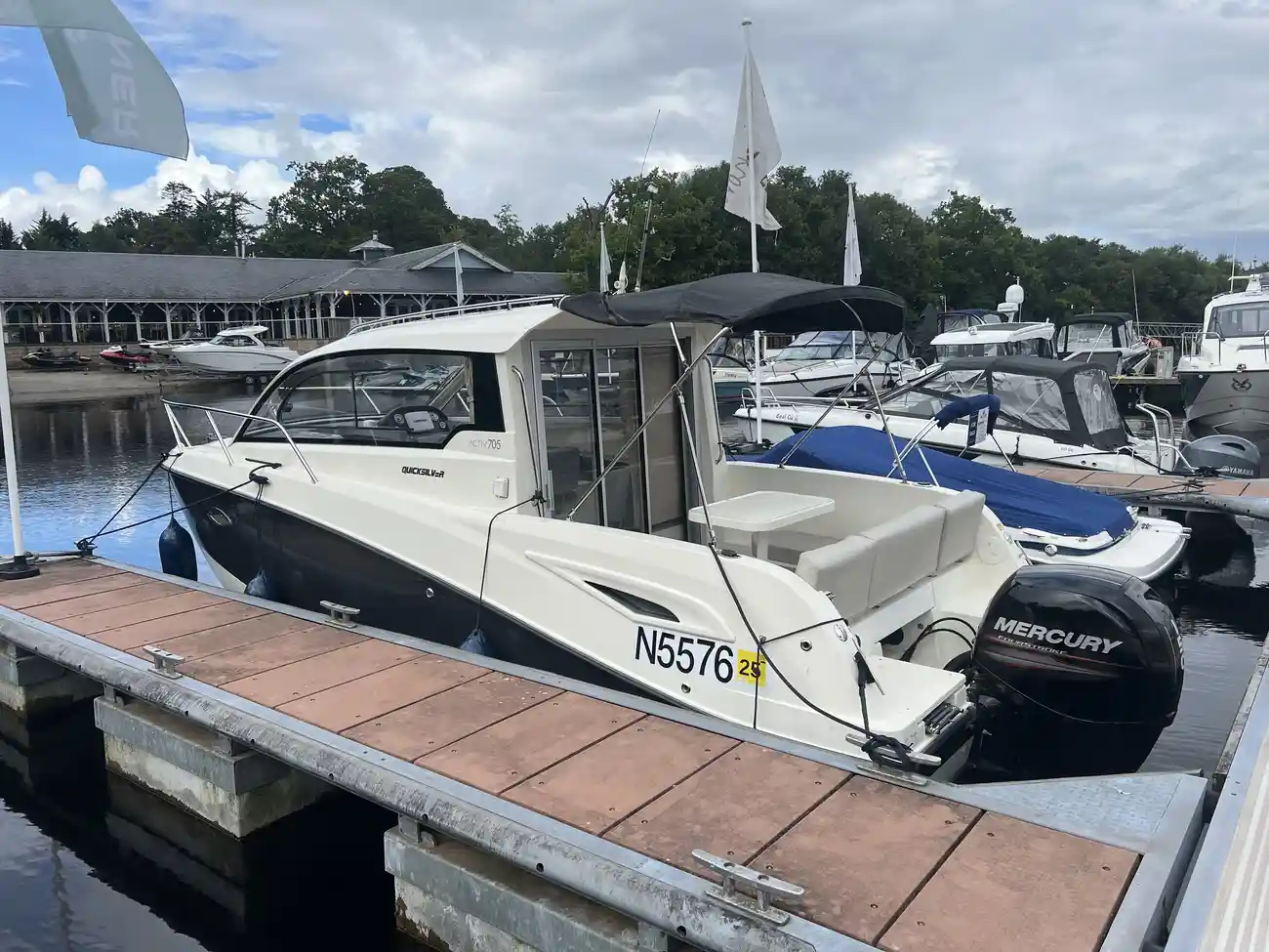 Marine Sales Scotland are pleased to present an immaculate example of the Quicksilver 705 Active. This vessel is well presented throughout and is fitted with the deluxe cruising package which includes electric windlass, Pressurised fresh water system, Electric coolbox, GPS/Fishfinder and VHF and fctory fitted stereo among other items. She is CAT C registered vessel and is ideally suited to both coastal and inland waters. Access is via the transom gate or via steps on both the Port and Starboard side into the cockpit. Entry to the cabin is by way of a triple sliding glass door. Once inside the boat has alight and airy feel due to the large opening windows and a large tilt and slide sunroof. Cabin layout is very clever and adaptable to suit your needs with a double seat at the helm and a navigators seat across the companion way. The helmsmans seat backrest can be moved to create the dinette with the fitting of the table and further can be transformed into a double berth.The helm is located midships on the starboard side and benefits from the Mercury smart Guages and Lowrance HDS7 chartplotter fishfinder. The galley is located on the port side with sink and drainer with a portable gas stove and electric coolbox located in the storage underneath. Forward of the navigators seat on the port side is the heads compartment which is fitted with a chemical toilet. The forward double berth features a large opening hatch and 2 interior lights. Further to this the boat has been fitted with webasto heating which truly makes it the boat for all weathers!! The vessel is powered by a Mercury 150EFI 4 stroke engine. This is truly great example of weekend family cruiser that is in excellent condition with very few hours and can be trailed with the addition of a trailer.