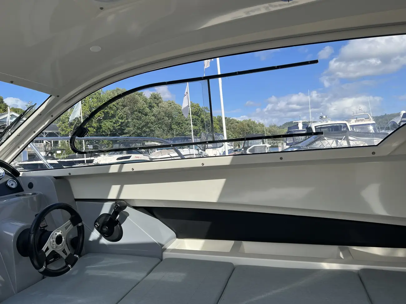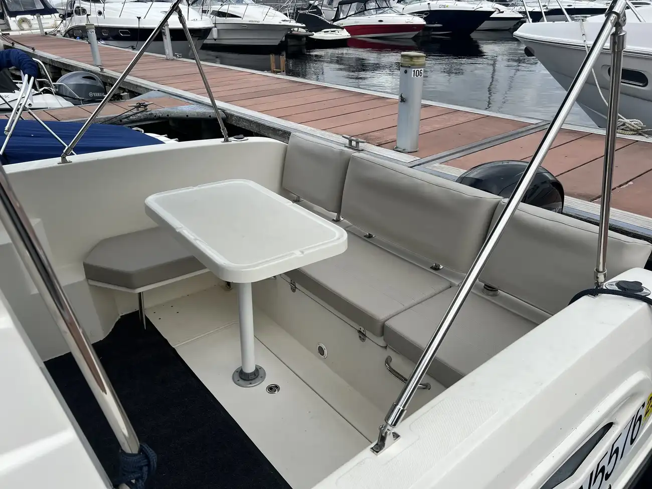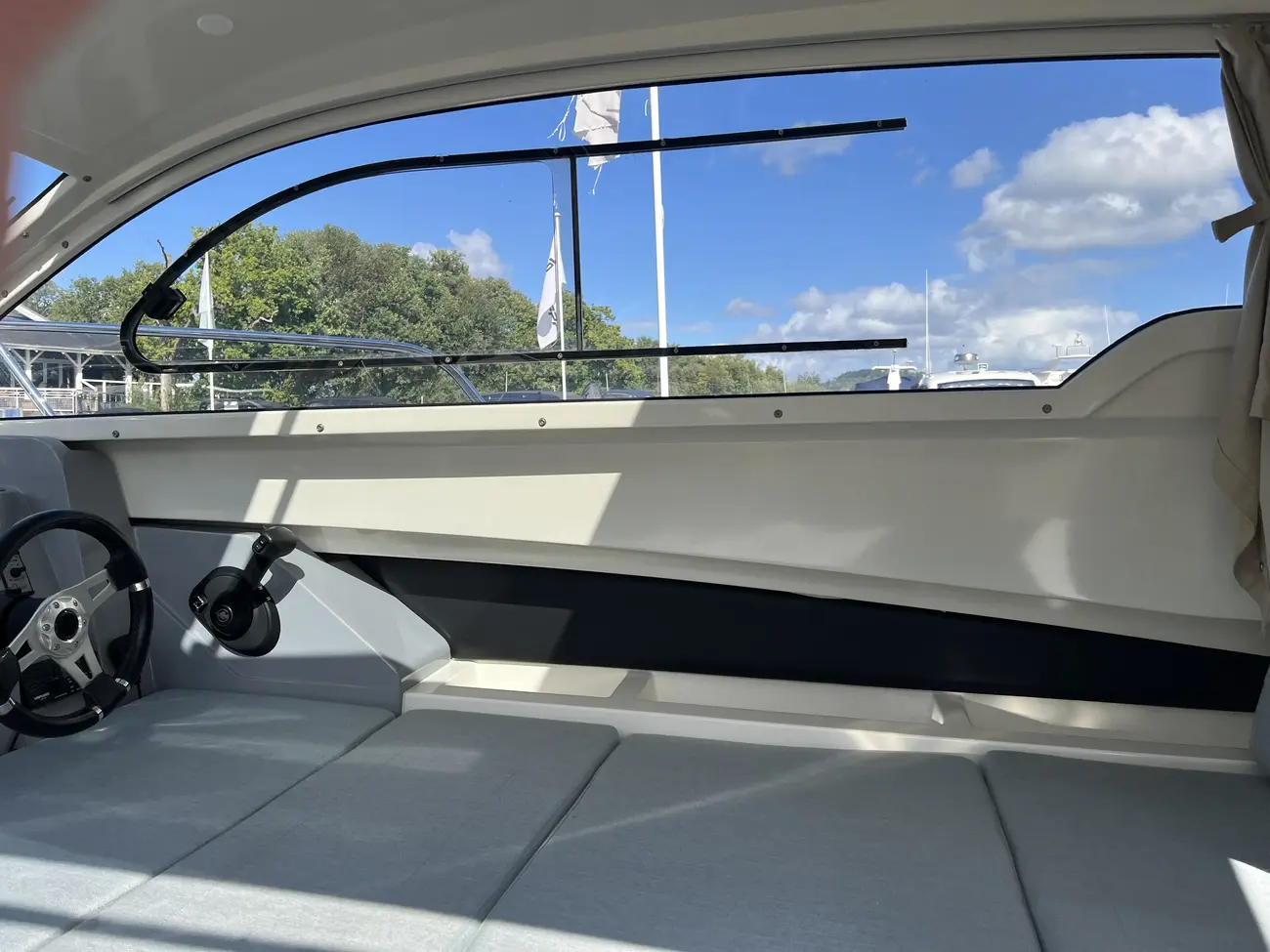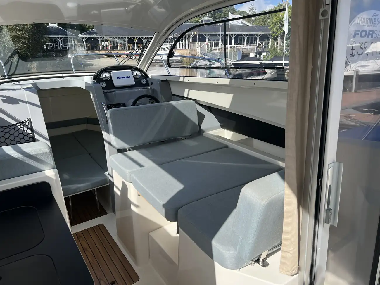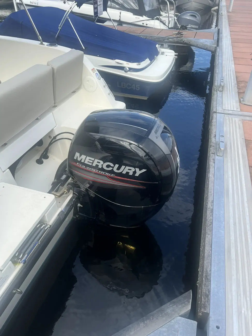 Marine Sales Scotland are pleased to present an immaculate example of the Quicksilver 705 Active. This vessel is well presented throughout and is fitted with the deluxe cruising package which includes electric windlass, Pressurised fresh water system, Electric coolbox, GPS/Fishfinder and VHF and fctory fitted stereo among other items. She is CAT C registered vessel and is ideally suited to both coastal and inland waters. Access is via the transom gate or via steps on both the Port and Starboard side into the cockpit. Entry to the cabin is by way of a triple sliding glass door. Once inside the boat has alight and airy feel due to the large opening windows and a large tilt and slide sunroof. Cabin layout is very clever and adaptable to suit your needs with a double seat at the helm and a navigators seat across the companion way. The helmsmans seat backrest can be moved to create the dinette with the fitting of the table and further can be transformed into a double berth.The helm is located midships on the starboard side and benefits from the Mercury smart Guages and Lowrance HDS7 chartplotter fishfinder. The galley is located on the port side with sink and drainer with a portable gas stove and electric coolbox located in the storage underneath. Forward of the navigators seat on the port side is the heads compartment which is fitted with a chemical toilet. The forward double berth features a large opening hatch and 2 interior lights. Further to this the boat has been fitted with webasto heating which truly makes it the boat for all weathers!! The vessel is powered by a Mercury 150EFI 4 stroke engine. This is truly great example of weekend family cruiser that is in excellent condition with very few hours and can be trailed with the addition of a trailer.