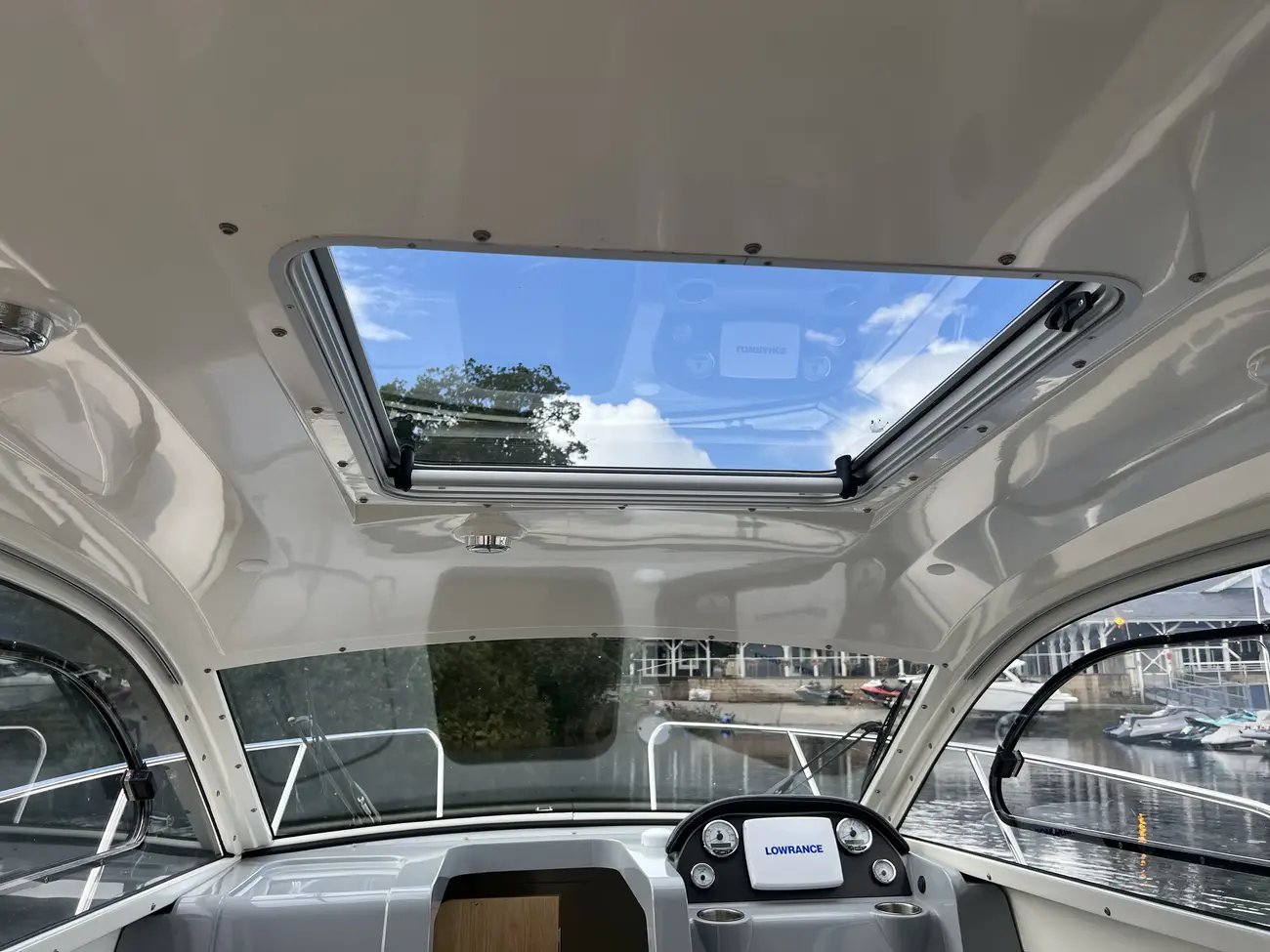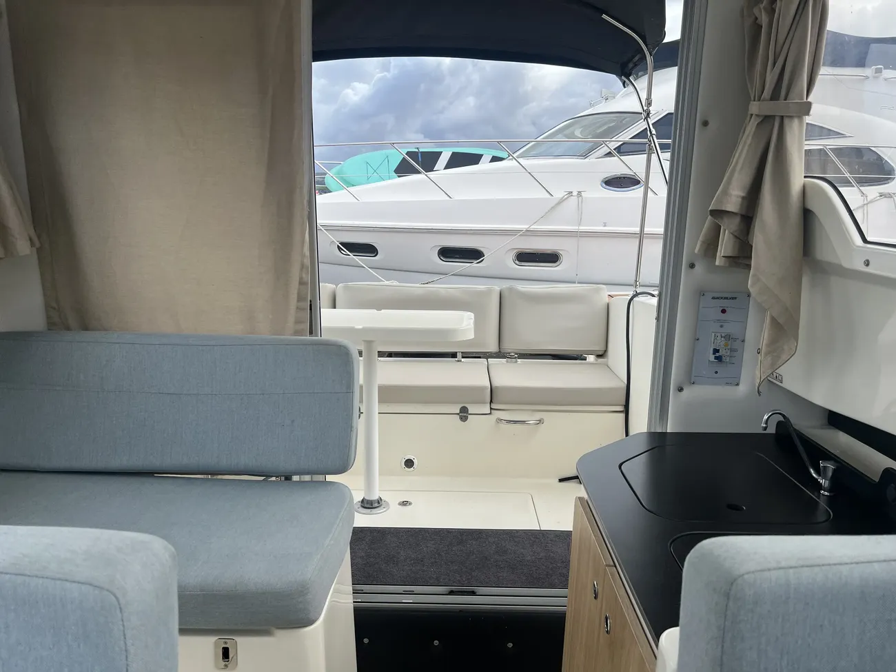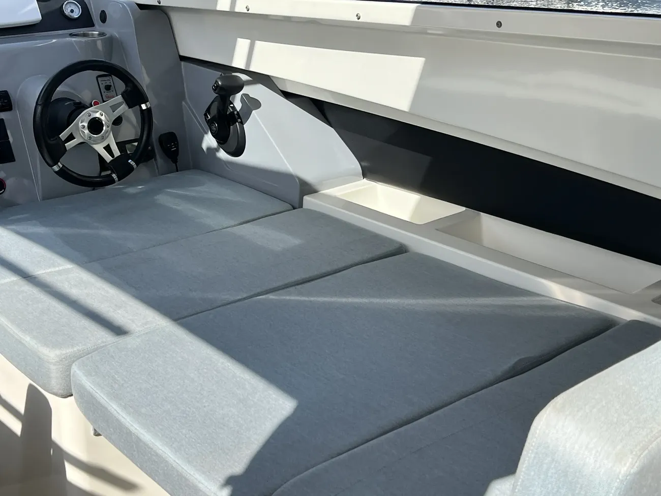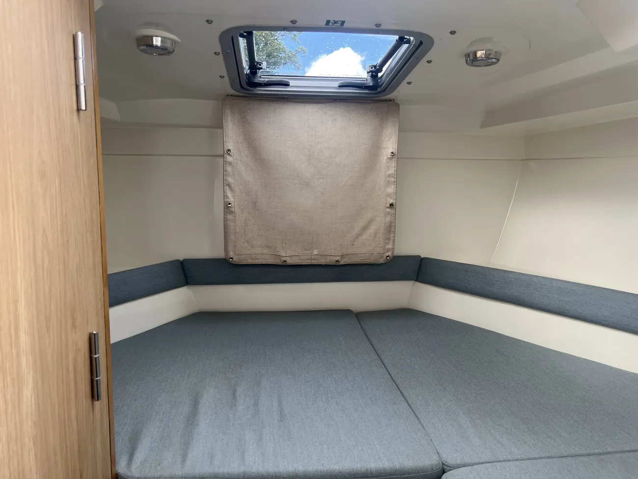 Marine Sales Scotland are pleased to present an immaculate example of the Quicksilver 705 Active. This vessel is well presented throughout and is fitted with the deluxe cruising package which includes electric windlass, Pressurised fresh water system, Electric coolbox, GPS/Fishfinder and VHF and fctory fitted stereo among other items. She is CAT C registered vessel and is ideally suited to both coastal and inland waters. Access is via the transom gate or via steps on both the Port and Starboard side into the cockpit. Entry to the cabin is by way of a triple sliding glass door. Once inside the boat has alight and airy feel due to the large opening windows and a large tilt and slide sunroof. Cabin layout is very clever and adaptable to suit your needs with a double seat at the helm and a navigators seat across the companion way. The helmsmans seat backrest can be moved to create the dinette with the fitting of the table and further can be transformed into a double berth.The helm is located midships on the starboard side and benefits from the Mercury smart Guages and Lowrance HDS7 chartplotter fishfinder. The galley is located on the port side with sink and drainer with a portable gas stove and electric coolbox located in the storage underneath. Forward of the navigators seat on the port side is the heads compartment which is fitted with a chemical toilet. The forward double berth features a large opening hatch and 2 interior lights. Further to this the boat has been fitted with webasto heating which truly makes it the boat for all weathers!! The vessel is powered by a Mercury 150EFI 4 stroke engine. This is truly great example of weekend family cruiser that is in excellent condition with very few hours and can be trailed with the addition of a trailer.