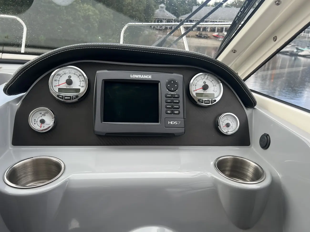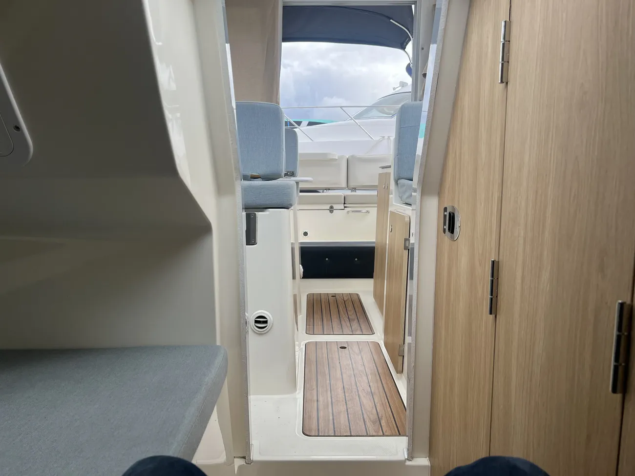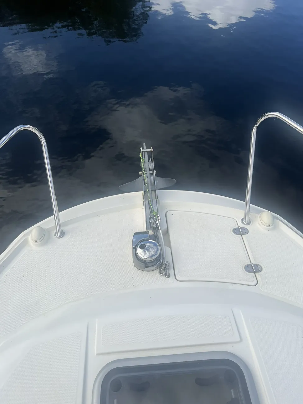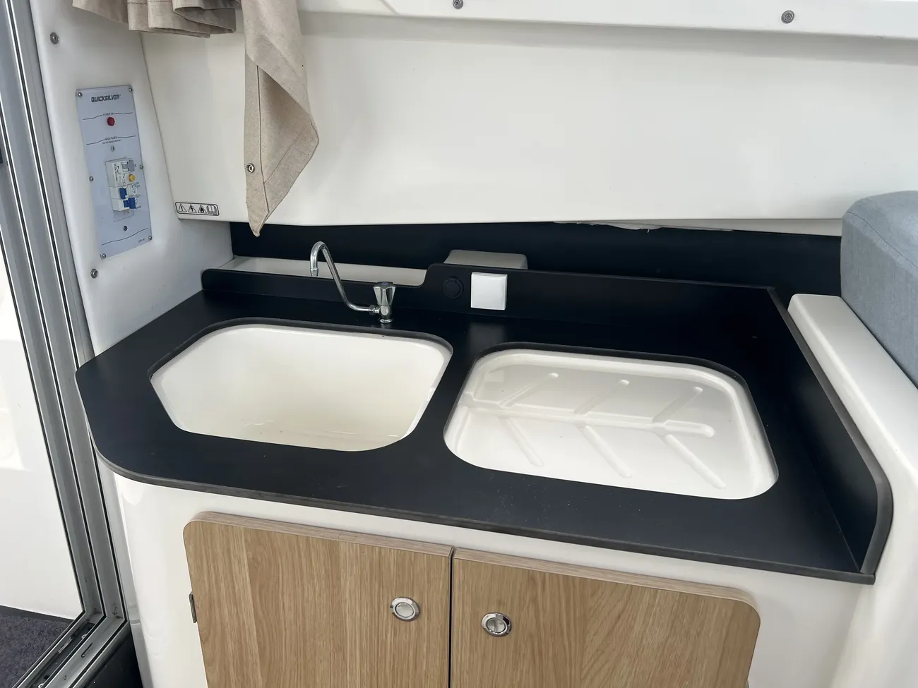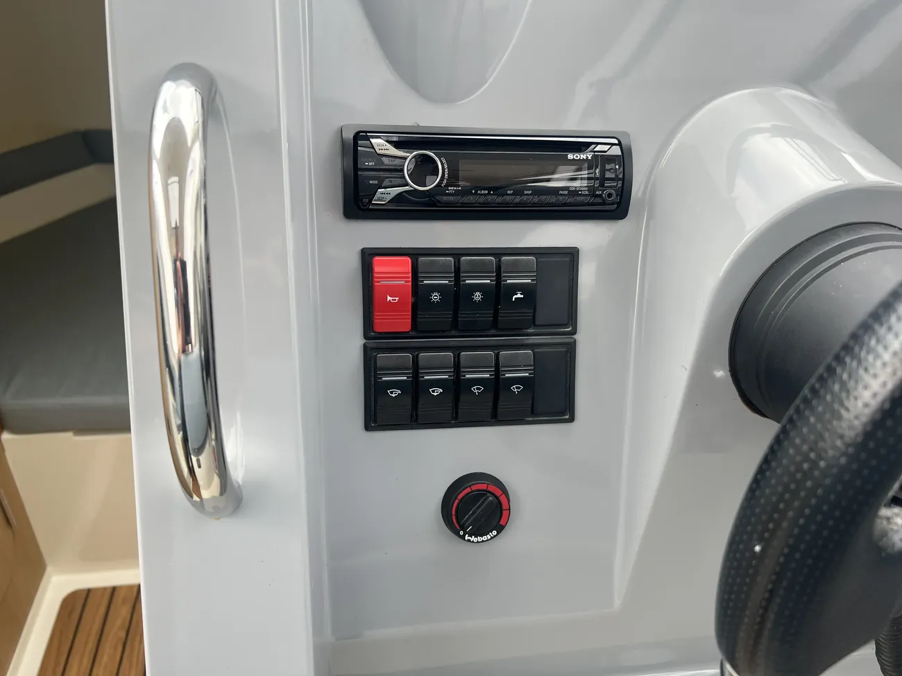 Marine Sales Scotland are pleased to present an immaculate example of the Quicksilver 705 Active. This vessel is well presented throughout and is fitted with the deluxe cruising package which includes electric windlass, Pressurised fresh water system, Electric coolbox, GPS/Fishfinder and VHF and fctory fitted stereo among other items. She is CAT C registered vessel and is ideally suited to both coastal and inland waters. Access is via the transom gate or via steps on both the Port and Starboard side into the cockpit. Entry to the cabin is by way of a triple sliding glass door. Once inside the boat has alight and airy feel due to the large opening windows and a large tilt and slide sunroof. Cabin layout is very clever and adaptable to suit your needs with a double seat at the helm and a navigators seat across the companion way. The helmsmans seat backrest can be moved to create the dinette with the fitting of the table and further can be transformed into a double berth.The helm is located midships on the starboard side and benefits from the Mercury smart Guages and Lowrance HDS7 chartplotter fishfinder. The galley is located on the port side with sink and drainer with a portable gas stove and electric coolbox located in the storage underneath. Forward of the navigators seat on the port side is the heads compartment which is fitted with a chemical toilet. The forward double berth features a large opening hatch and 2 interior lights. Further to this the boat has been fitted with webasto heating which truly makes it the boat for all weathers!! The vessel is powered by a Mercury 150EFI 4 stroke engine. This is truly great example of weekend family cruiser that is in excellent condition with very few hours and can be trailed with the addition of a trailer.