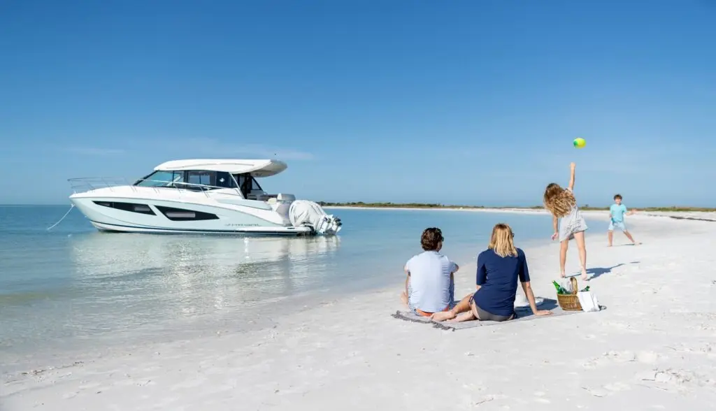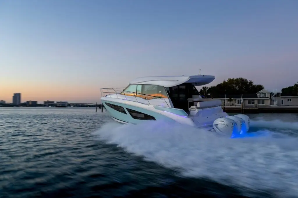 Open up new horizons with the Regal 42 XO. Relax in beautifully crafted cabins and enjoy a layout so spacious, there’s still room to add an optional second head or lower refreshment center. The standard en-suite head, crafted with premium materials, includes a separate walk-in shower. Upstairs, the full-beam retractable hardtop, opening side windows and sliding glass doors merge the upper salon and aft patio seamlessly, so everyone on board can enjoy outdoor living and entertaining together.