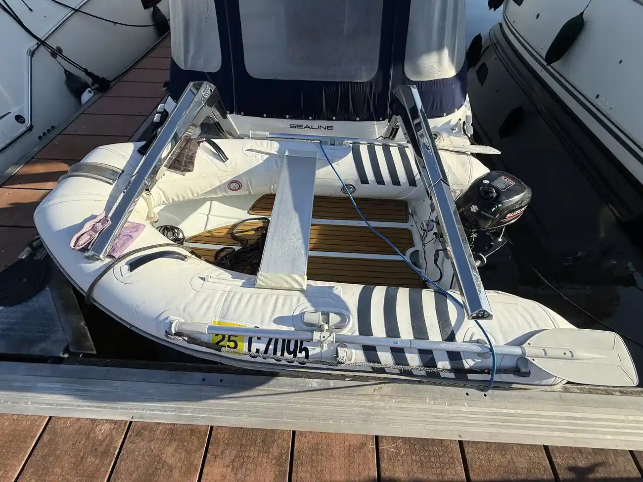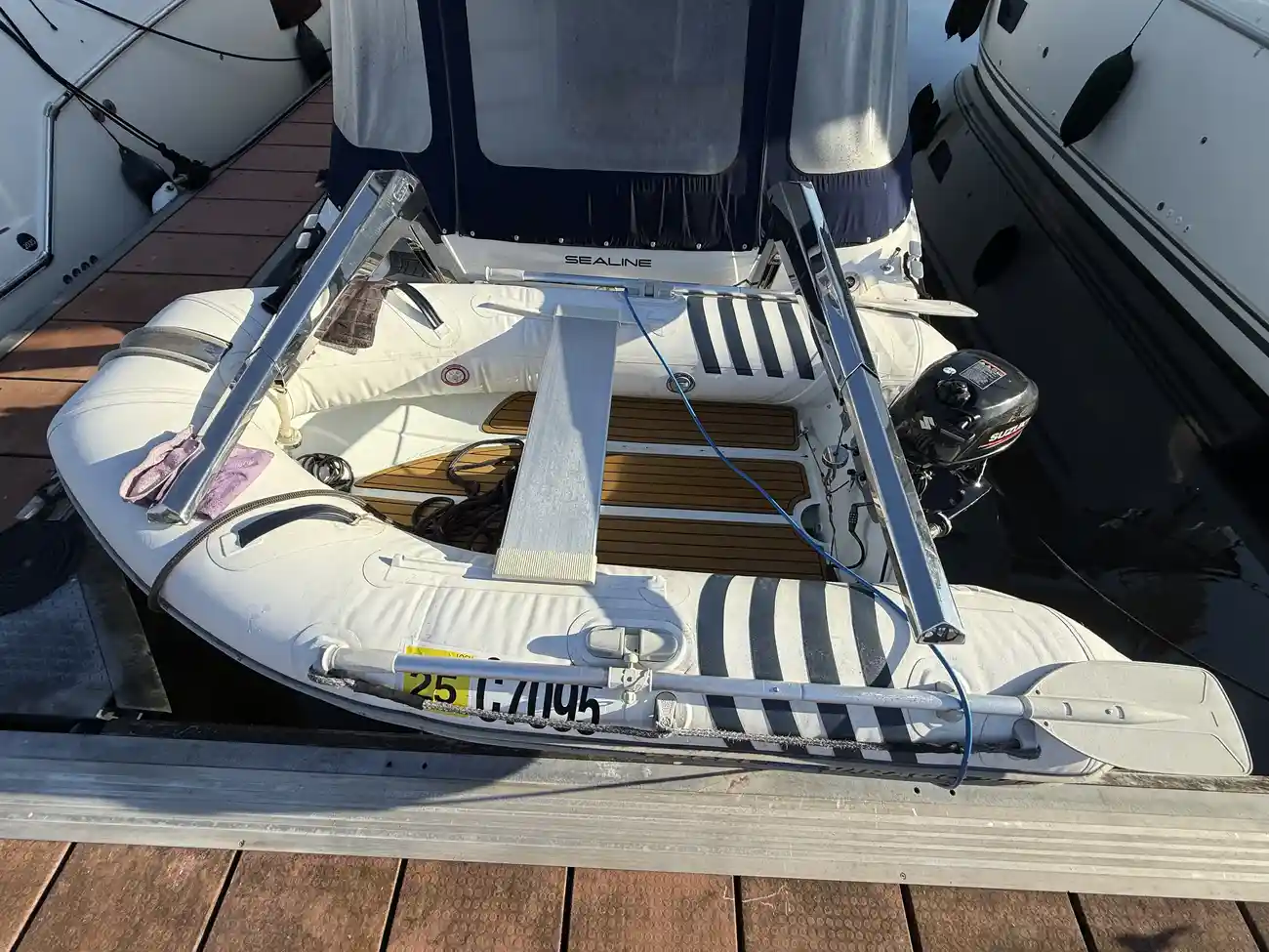 “Miss Sunshine” also benefits from bow and stern thrusters, which can be operated from both helms or remotely, greatly enhancing control when berthing. The tender and Suzuki ouboard engine also come with the vessel, mounted on stainless steel Simpson davits with internal winches is a light weight aluminium RIB – perfect for getting ashore when at anchor. A new flybridge cover has been recently installed.