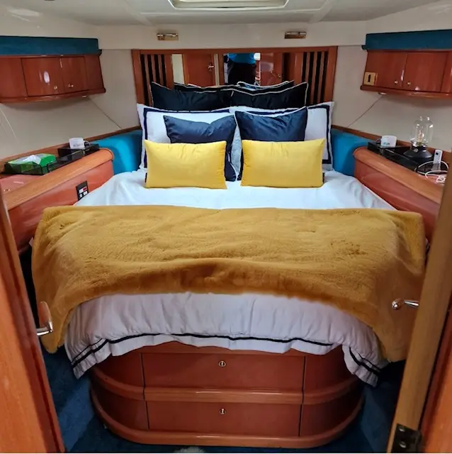 The forward VIP cabin boasts a generous walk-around double berth, ample storage, and en-suite access with Jack and Jill functionality to the day heads. The aft master cabin offers a large double berth, private en-suite, and abundant storage, creating a true owner’s retreat.