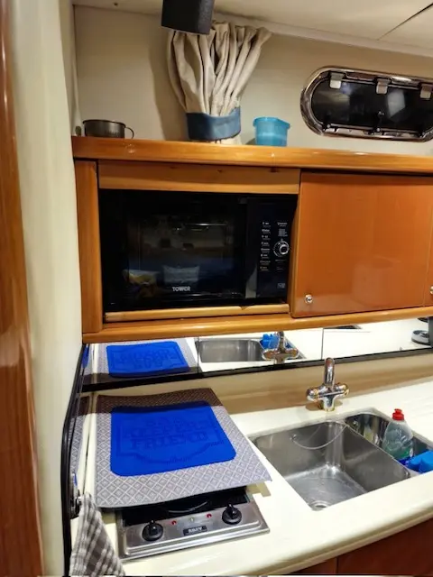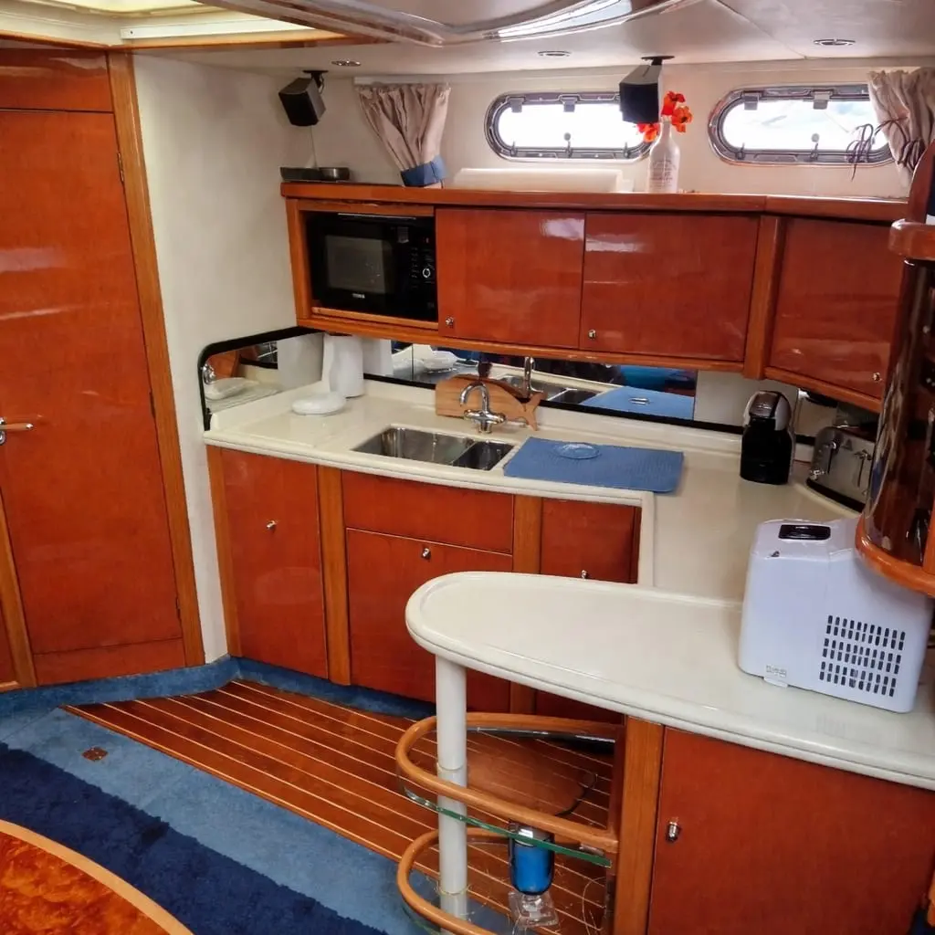 Below deck, the accommodation is both spacious and elegant. The saloon features a lowering table for flexible dining or relaxation, while the fully equipped galley includes a double hob, convection microwave, and fridge/freezer—ideal for extended stays onboard.