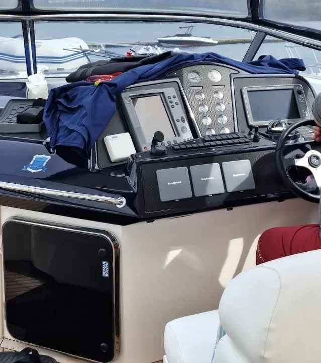 The well-appointed helm station is equipped with twin multifunction displays including radar and echo sounder, VHF, weather system, and autopilot. Bow and stern thrusters, both with remote controls, ensure effortless manoeuvring, while the electric sliding sunroof allows you to fully enjoy long summer days on the water.